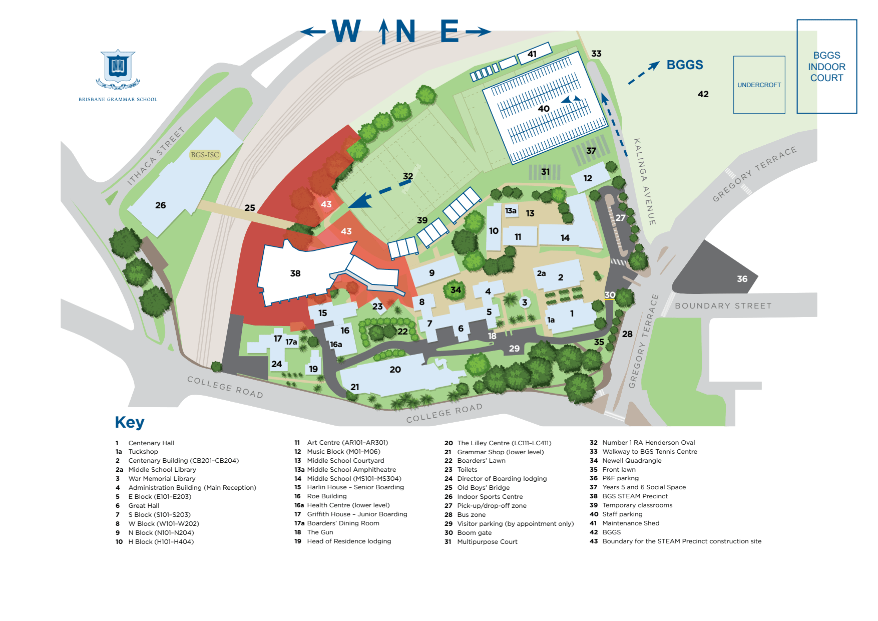 The bus drop-off zone is in front of the School on Gregory Terrace (number 28 on map).